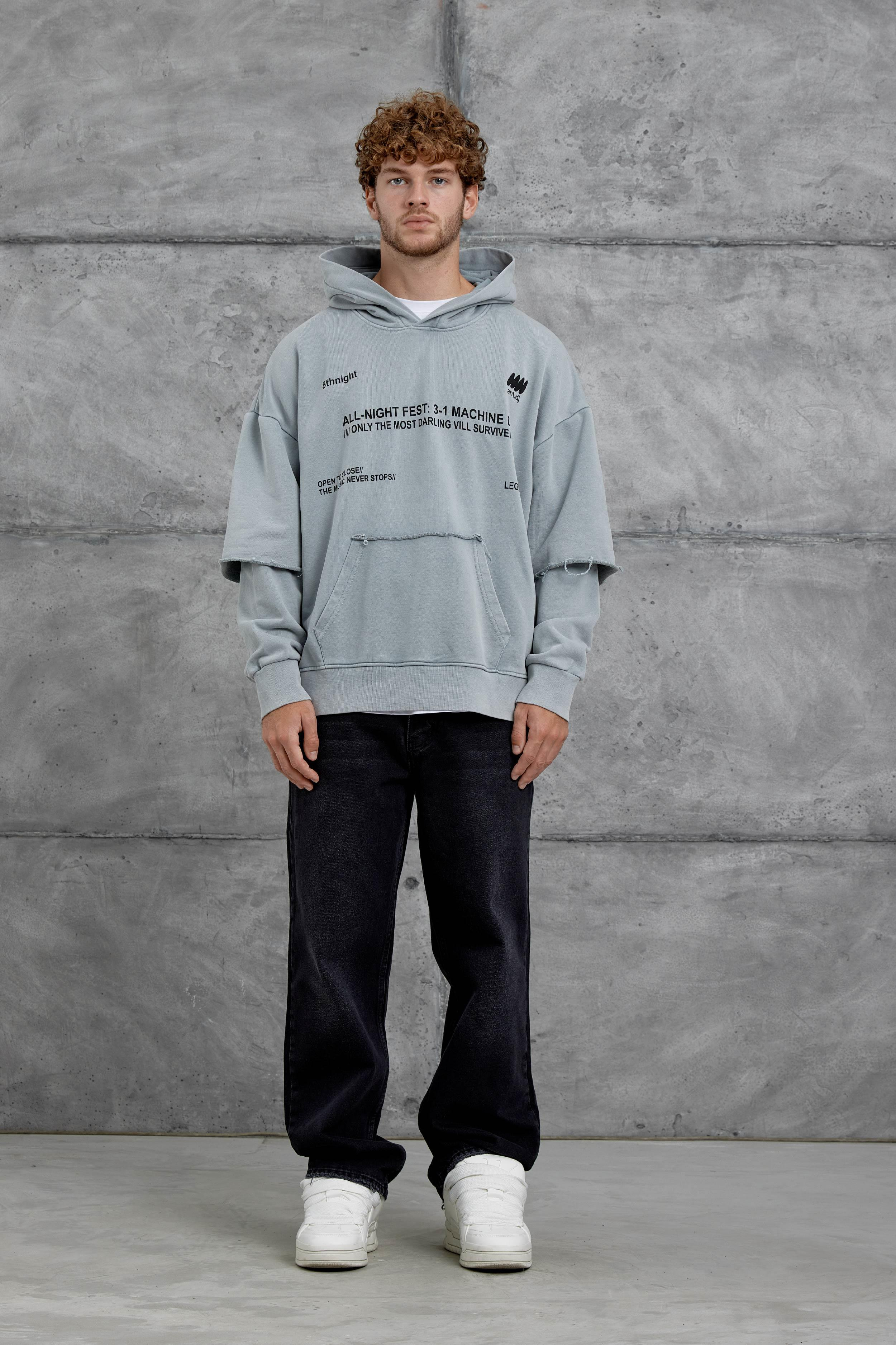 Gri Yazı Detaylı Parça Kollu Yıkamalı Oversize Kapüşonlu Sweatshirt (P-004379)